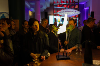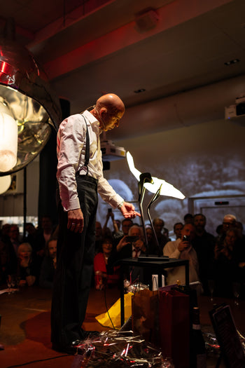 The evening unfolded as a layered introduction. First came the reveal of stefanlindfors.shop, the brand’s official home online, set to grow into a destination for collections, collaborations, and limited editions. Then came the debut of the very first product: the Scaraboy lamp, a sculptural piece paying homage to Ingo Maurer while capturing the playful and unexpected spirit at the core of Lindfors’ practice. And finally, the true highlight: the unveiling of the brand itself. Carrying the designer’s own name, STEFANLINDFORS®️ takes forty years of exploration across disciplines into a new global chapter.